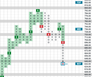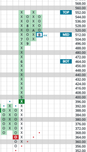 As you can see, the stock has already moved from arguably overbought back to the middle of its expected trading band. It is not a value yet and I would not argue there’s a rush to enter but interested traders could perhaps start nibbling. Because there has been limited backing and filling in this area, it would be hard to come up with a stop loss, except for a double-bottom break if the declining column of O’s fell to 488, so we don’t have one to recommend at this point.